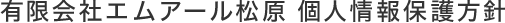 有限会社エムアール松原(以下当社と呼びます)では、当社が保有する個人情報について個人の人格尊重の理念の下に、関係法令その他の規範を遵守した業務運営に努め、以下の基本方針に則り、個人情報保護に努めます。